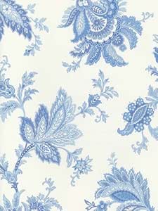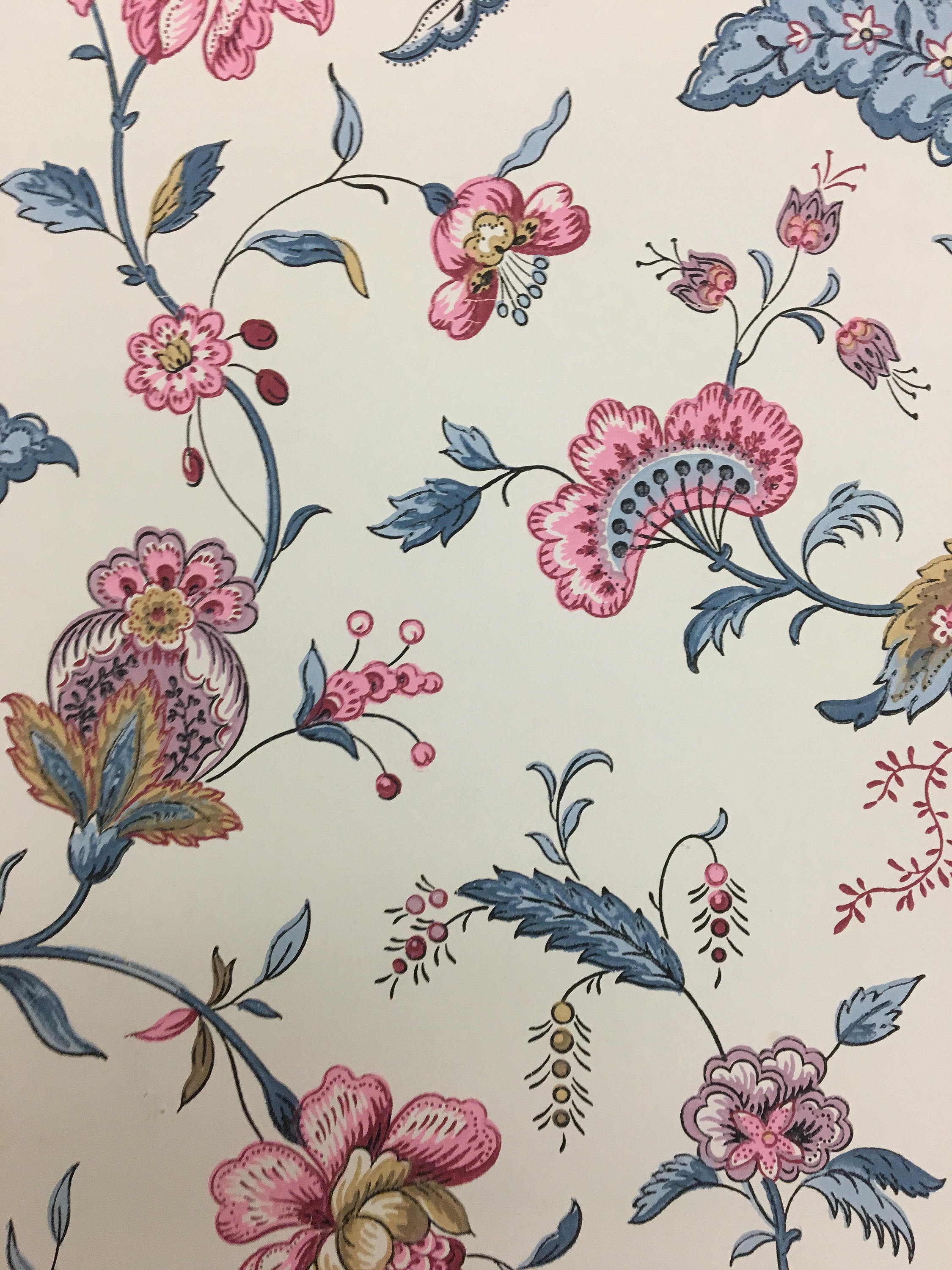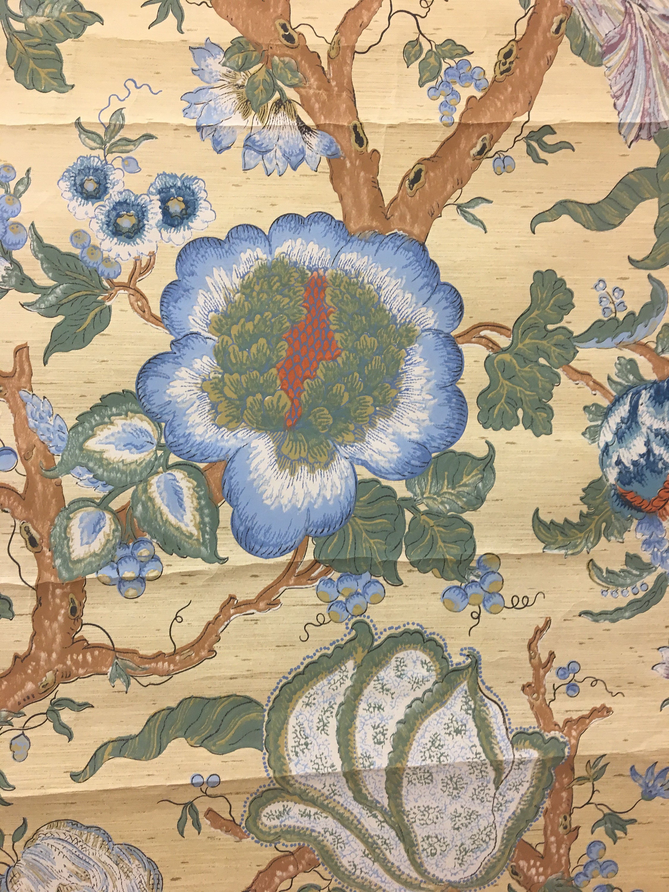 This pretty floral has jacobean flowers and leaves in gorgeous rich colors including sky blue, lake blue, sage green, salmon, bright red, white, light.